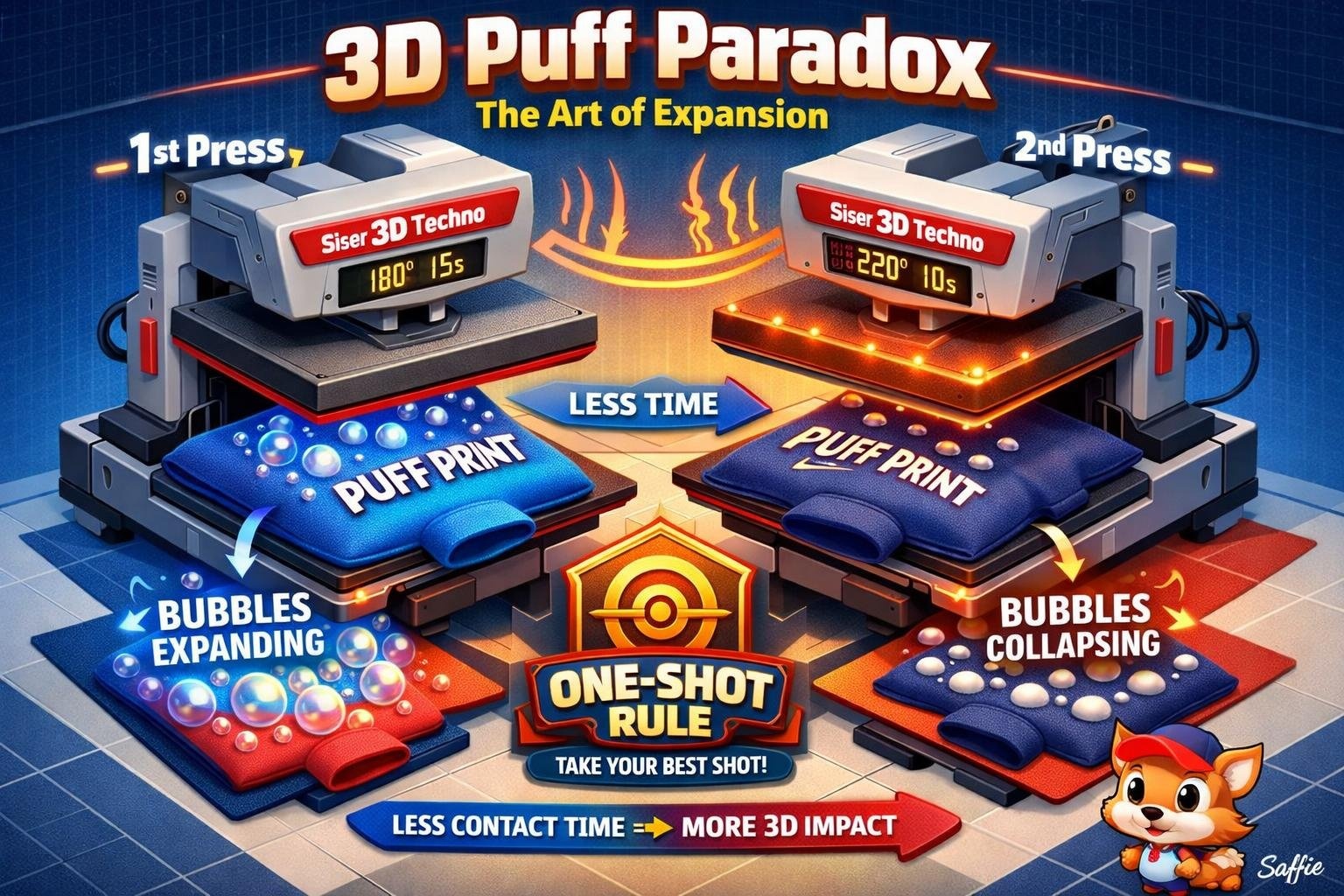 De Ellende: Je perst een logo op een polyester gewatteerde jas en de stof trekt onmiddellijk samen. Het resultaat? Een gerimpeld logo en een verpest kledingstuk.