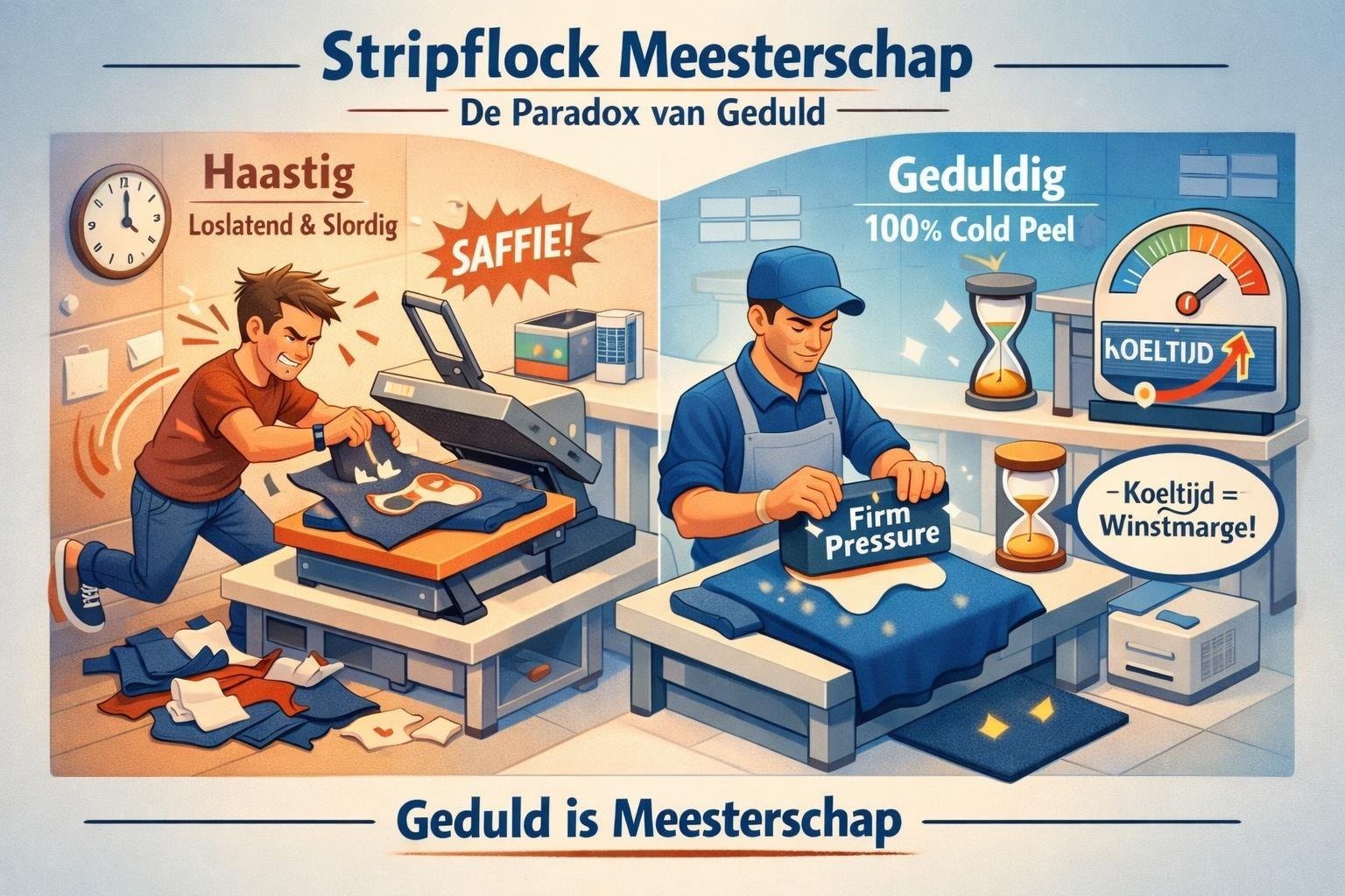 De Peter-Check: Flock is dik en houdt hitte vast. De gouden regel: Cold Peel. Laat de drager volledig afkoelen voordat je hem verwijdert. Verhoog daarnaast de druk (Firm Pressure) zodat de lijm door de dikke vezellaag heen in de stof wordt geduwd.